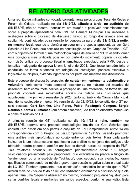 O Relatório de Atividades abaixo explica em detalhes como se construiu o texto do ‘substitutivo global’, de forma Democrática, Participativa e Transparente.
